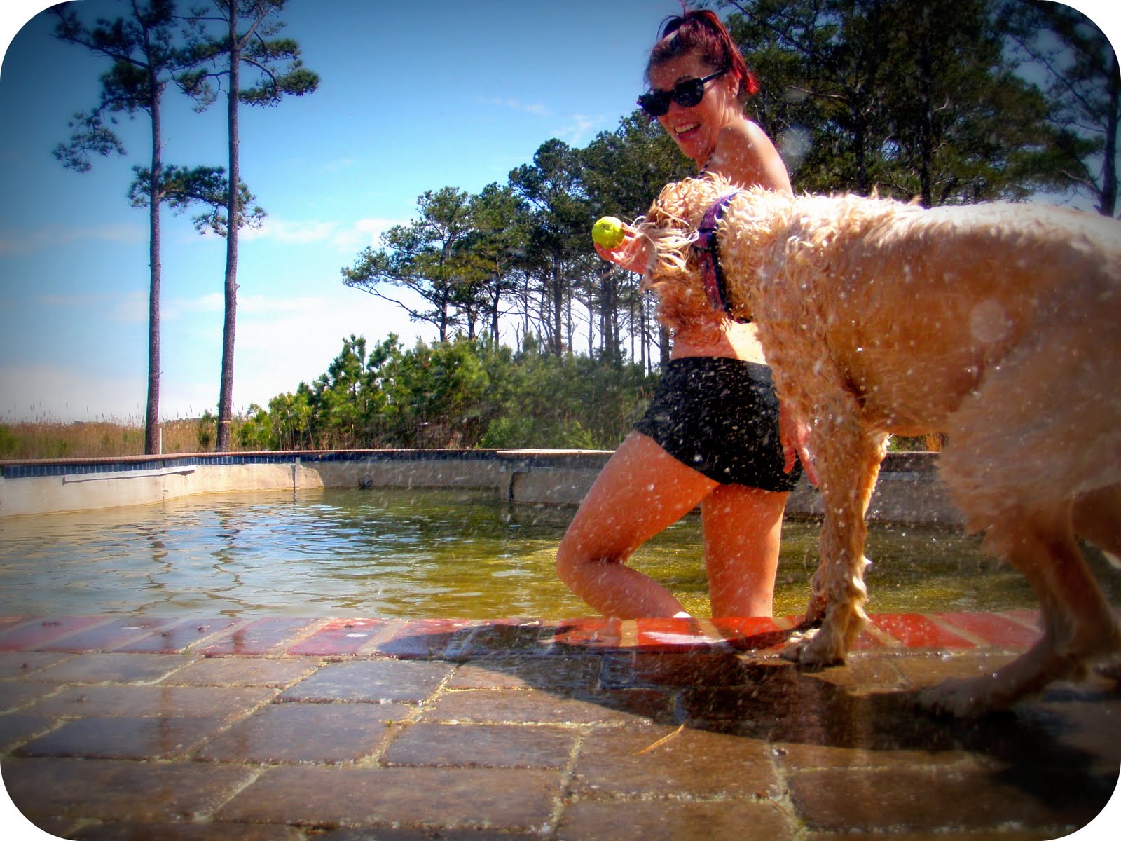 We also hung out at the unopened swimming pool in our neighborhood. It's filled with rain water and completely vacant. Perfect for playing fetch on a hot day... and getting splashed by a soaking wet labradoodle.
