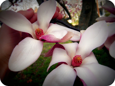 Look at the beautiful Magnolia tree blossoms! They're gorgeous. Their centers are so intricate. This flowering tree was blooming along the Pocomoke River during my daily walk this afternoon. April showers (& 75 degree days of sunshine) bring May flowers. Spring is almost here. Get excited (& get your summer clothes out of your attic)!