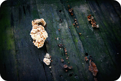 Fungi growing on the slippery, mossy floorboards. There was a leak in the ceiling a few feet away.