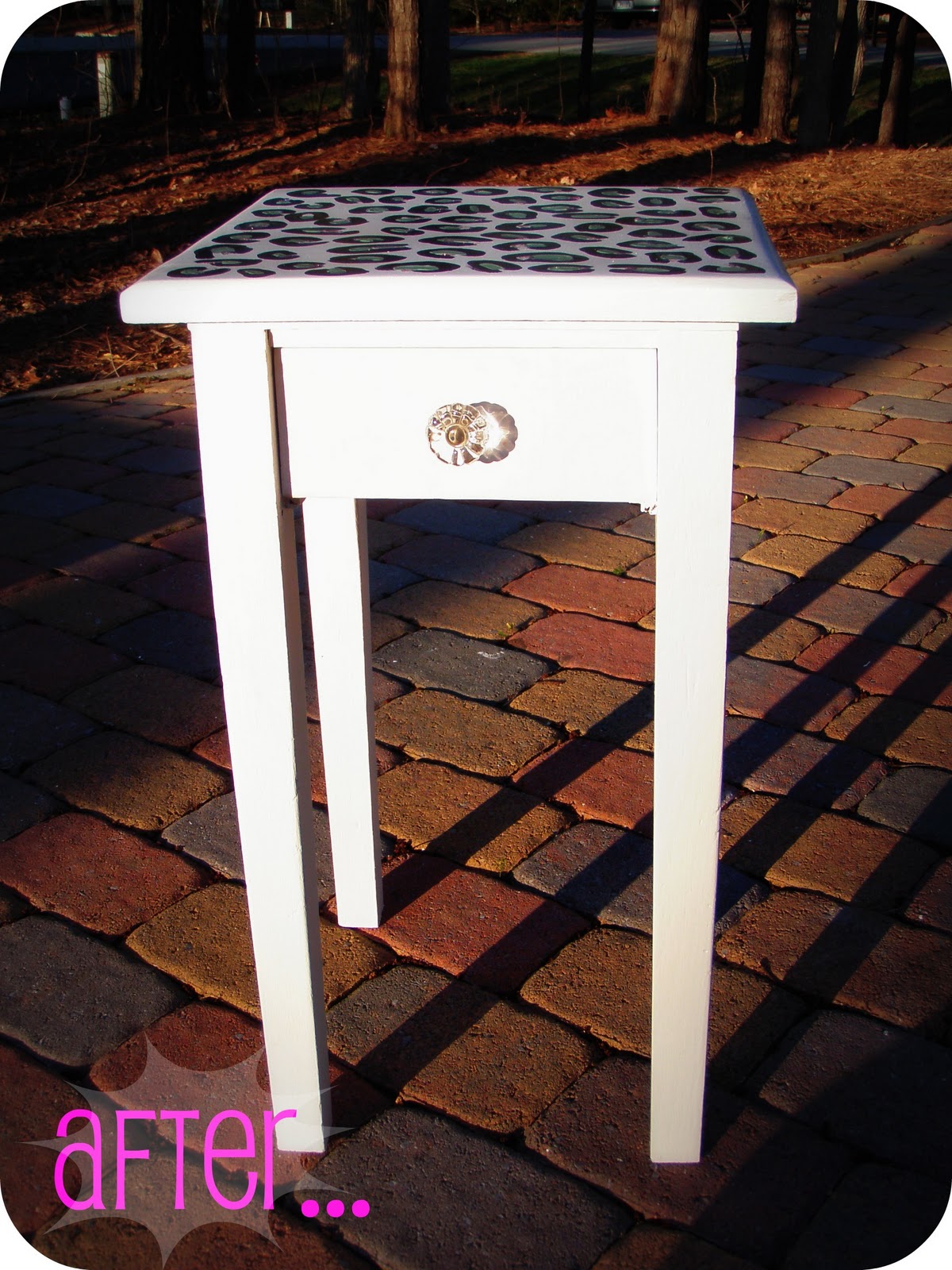 After a good sanding, 3 coats of primer (it was tough to cover up that bad black paint!), 2 coats of flat white paint, hand-painted leopard spots, 1 spray of clear coat and a crystal drawer pull, I'm loving this little find! & after...