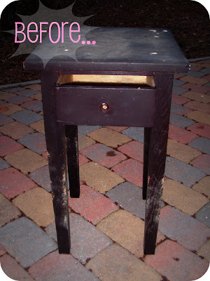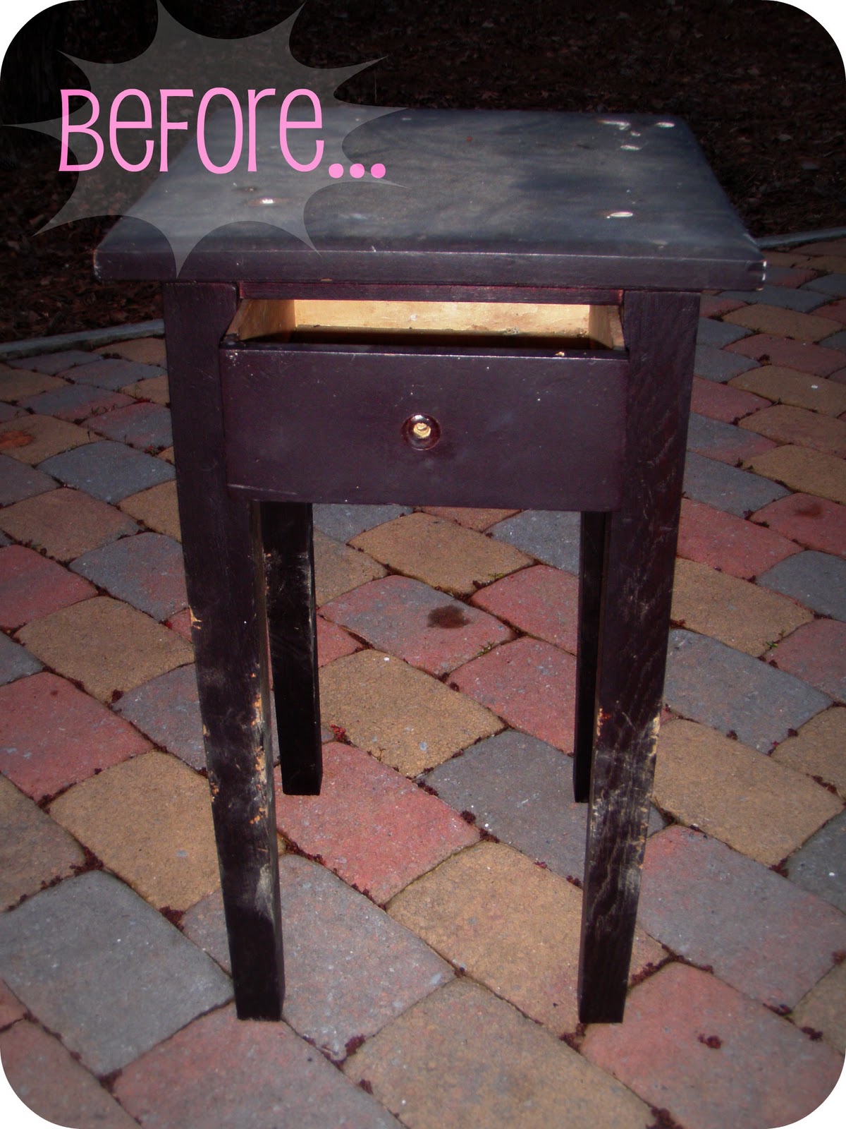 I'm acquiring quite the furniture collection... all thanks to my community members who have wonderful trash. I revamped this find to match another piece of trash, my leopard table. Hopefully I'll have room to put both of these pieces together in my future house. Here's this little nightstand's before mugshot...