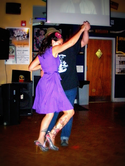 By 9 o’clock PM, my friend Tracy had been crowned Miss Rods & Rockers 2011, my friend, Sarah, placed in the contest, too, and I was wearing my dancing shoes. I can't believe I missed seeing the pin up contest earlier that afternood. I wasn't going to miss a night of swing dancing, also. I rushed home from work to put on my home-made red and white dancing dress and red heels. A much needed night of feeling girlie and wearing pin-curls was exactly what the doctor ordered.