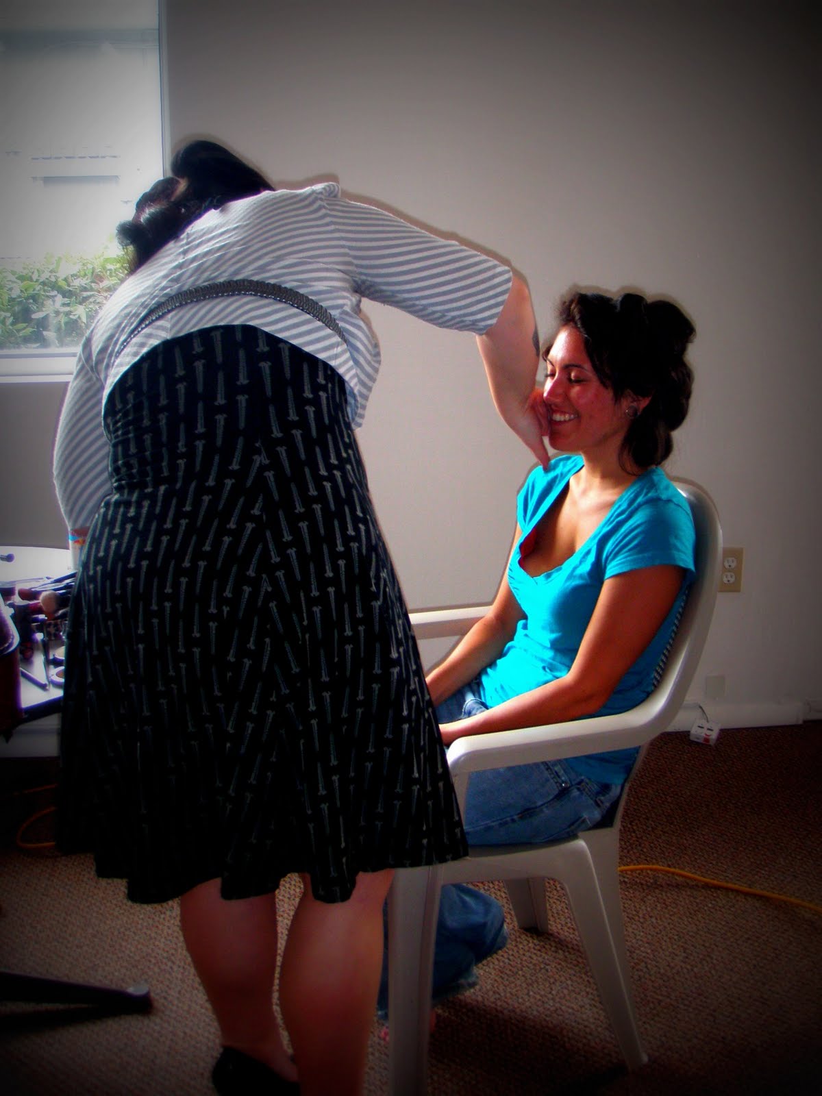 Lola, of Hello Sailor! Pin-ups, did makeup. Rachel, of A Perfect Face, did hair. Tracy looked fabulous done up! I've never seen her with this much makeup on before. I don't think Tracy had ever seen herself done up like this before, either. Fake eyelashes and everything!