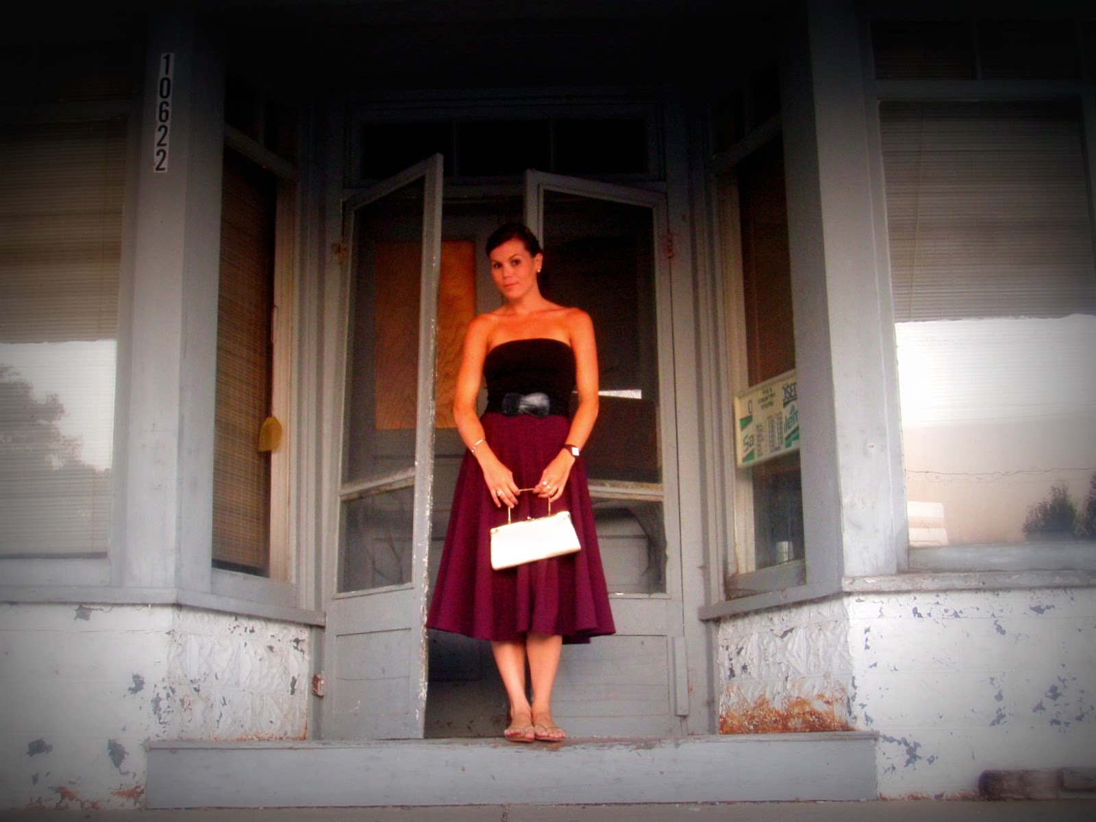About that outfit. I just picked up this full circle skirt at a thrift store. It was only $5.75! Yow! Based upon the seams, it's 100% hand-made. The fabric is so nice, thick, and moves so well. The eggplant color is splendid. It was love at first sight. That dainty gold vintage purse was also purchased at the thrift store for only $1. I swear those thrift-shop employees cut me a deal sometimes because they know I'm a sucker for vintage items that most people just overlook while shopping.