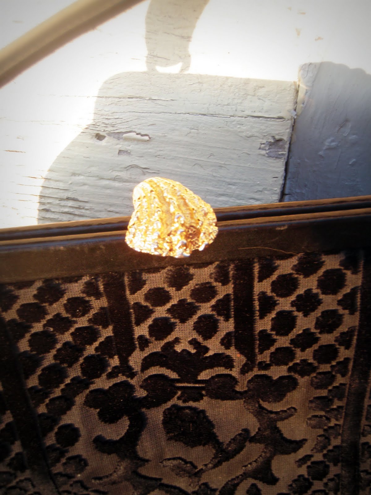 I love the black damask velvet print and gold sea shell clasp. It just screams my name, don't you agree? I wonder how old it is. Some stylish lady must have purchased it decades ago.