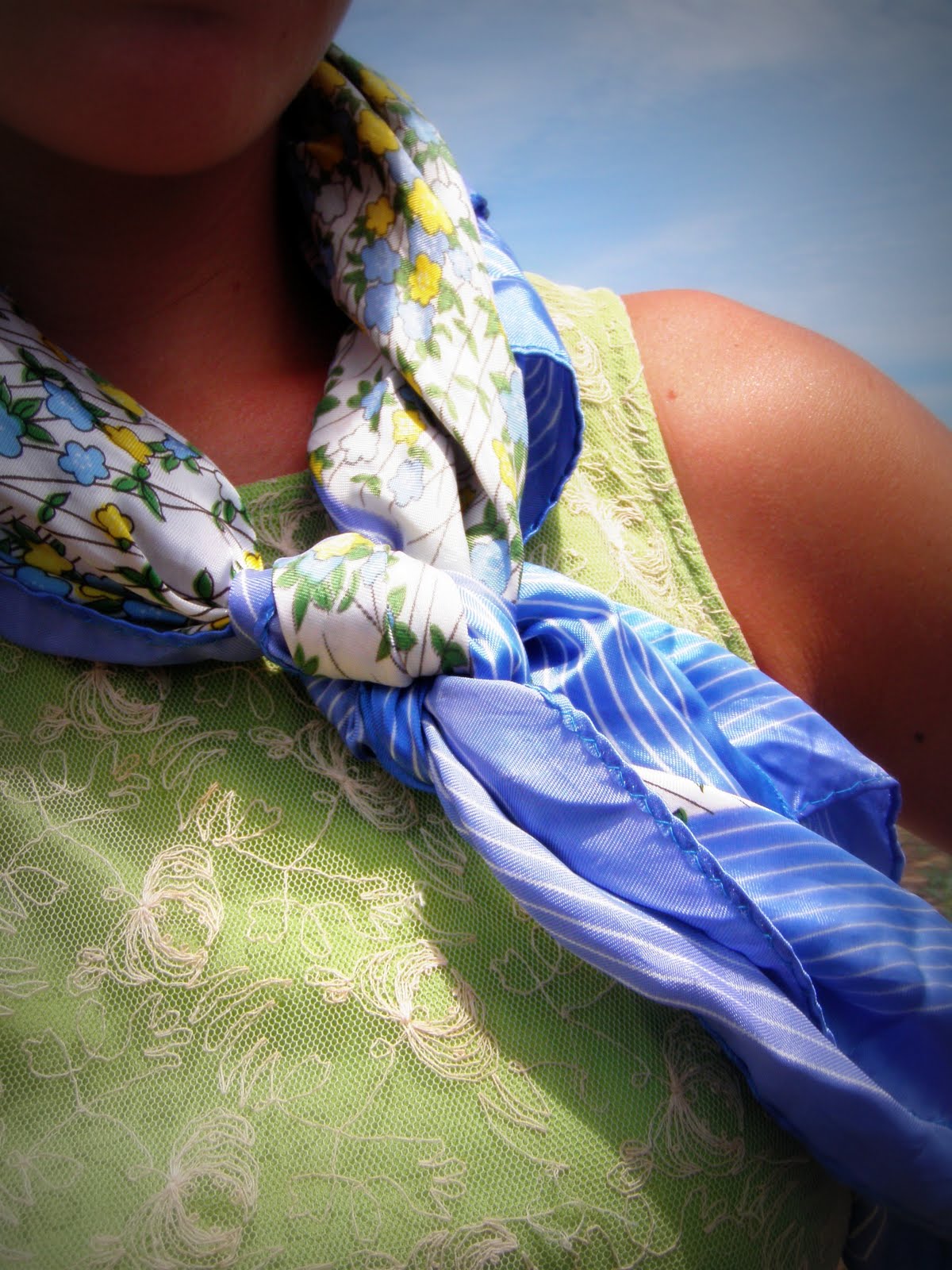 A green vintage French Connection dress given to me by my awesome friend Sarah a few years ago (thanks for the hand-me-downs, ProSauce!). It has this beautiful mesh embroidered layer and is 100% cotton. So comfortable on a warm summer day. I paired a pretty vintage scarf from the thrift store with it to fancy it up a bit. A vintage brown Etienne Aigner skinny belt passed down from my Mother and Jessica Simpson leather wedges scored at the Salvation Army for only $6.50!
